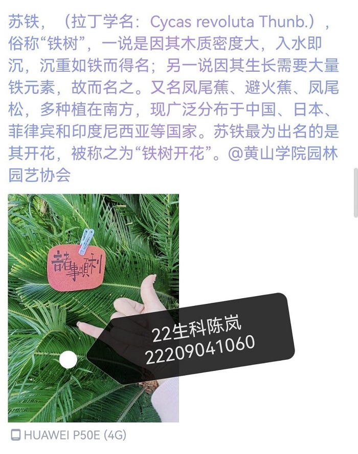 参与本次活动要求同学们在校园中的各处找寻由工作人员提前放置的名牌,搭配每日不同手势与指定植物合影。再由同学们自己查找资料,加上对相关植物学名特性等的认知,并于当天@园林园艺协会官方QQ号,发布在自己的QQ空间中。连续三天进行如上打卡后,需将QQ动态截图标注上专业、姓名、学号上传至美植打卡群相册中。活动后期,工作人员整理好参与者名单,依次发放学分。