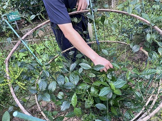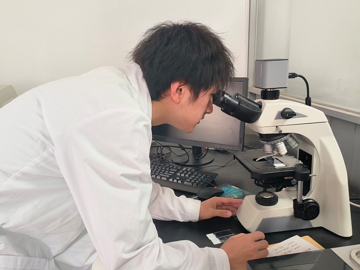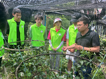 实践团队通过问卷调研的形式了解当地遭受珠兰花叶斑线虫的危害情况后,驱车前往安徽黄山雾云间生态庄园,与负责人展开对珠兰花茶以及珠兰花叶斑线虫病害的交流讨论。在黄山雾云间珠兰花种植及茶叶窨制示范基地负责人苏兴、指导老师王秋阳和郑磊的带领下前往珠兰花种植基地,据负责人苏兴介绍,珠兰花叶斑线虫可以水为介质传染,传染性极强且难以根除,并带领学生近距离观察患病植株叶片。珠兰花叶斑线虫是由草莓滑刃线虫侵染珠兰引起叶斑的线虫病,被当地花农称为‘落叶鬼’,重病株枝弱叶稀,开花甚少,几乎完全失去经济价值,只能将其毁掉。由于珠兰叶斑线虫病的危害,1984年安徽歙县三花大队共毁掉3000多盆珠兰,经济损失约20万元。