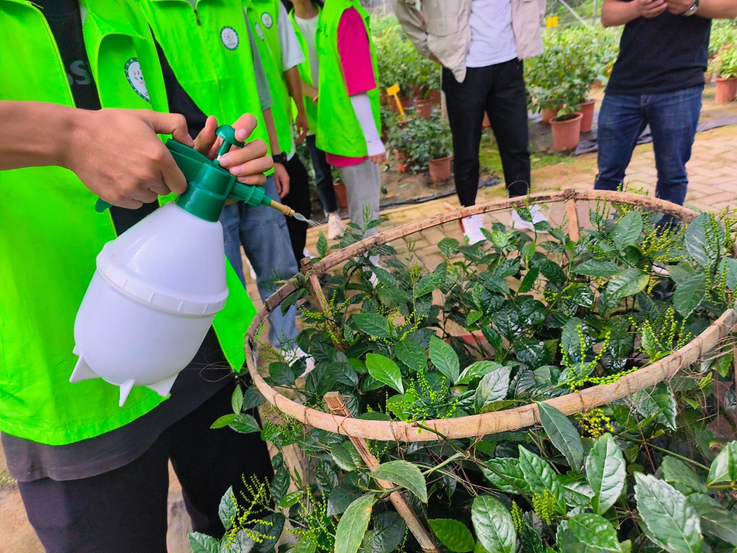 有了理论知识的支持,“珠兰花叶斑线虫防治”实践服务团队携带相关药剂重返黄山市歙县徽城镇鲍川村,给出现珠兰花叶斑线虫灾害的茶田进行斑线虫防治与灭杀,并登记保留茶田农户的相关信息,为后期斑线虫防治的效果进行回访奠定基础。与此同时为防止珠兰花叶斑线虫在这些地区再次出现泛滥的现象,团队成员依托展板与宣传单为企业人员与茶农宣传珠兰花叶斑线虫的相关防治知识。