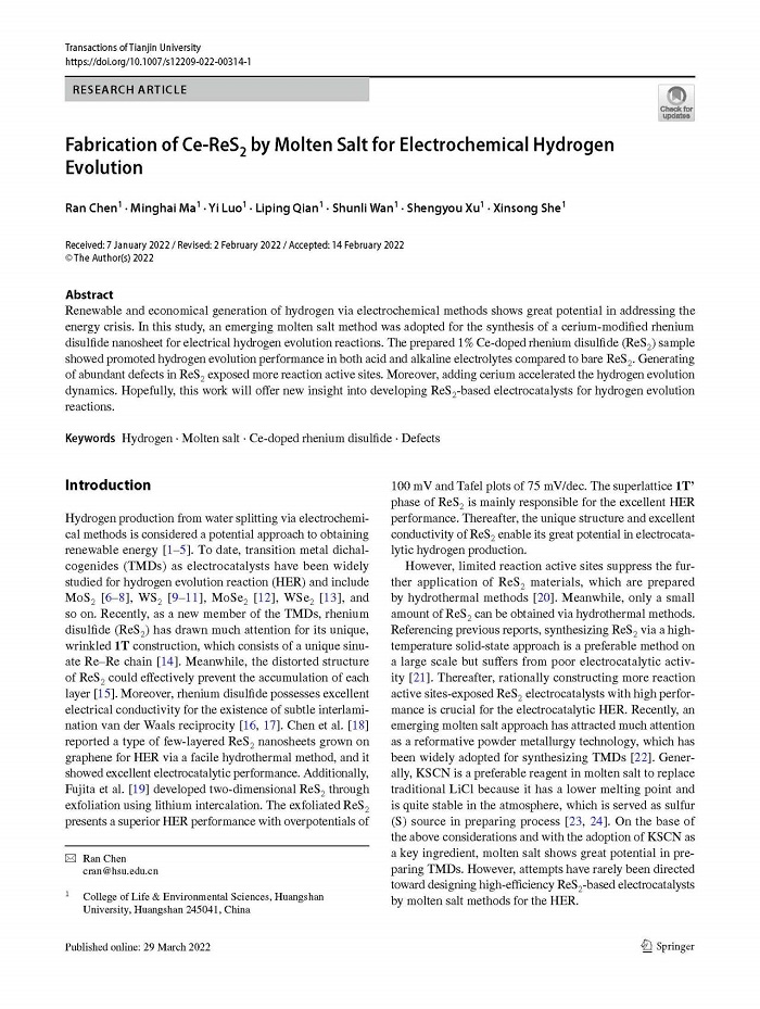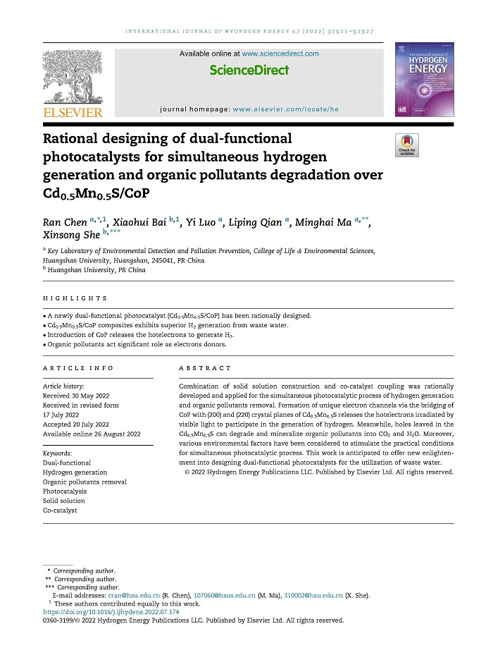自2022年以来,我院陈然博士以第一作者/通讯作者在《Transactions of Tianjin University》(IF=7.1)、《International Journal of Hydrogen Energy》(IF=7.2)、《Chemosphere》(IF=8.8)等期刊上连续发表论文10余篇,主要涉及新污染物治理和能源再生方面的基础前沿成果。如以抗生素和农药为目标,针对其在治理过程中出现的选择性吸附低、降解缓慢等难题开展研究。系统分析了污染物在分子水平上的迁移和转变机制,并提出了治理措施,为新污染物的高效去除提供了参考和实验依据;以水分解为目标,探索氢能的再生利用。实验发现水分子在光或电的驱动下,存在氢气产生缓慢、难以有效脱附等问题,针对性的提出调整策略,提高氢能再生的效率。该研究有助于进一步理解水分解产氢的过程并为其开发和利用提供借鉴和理论启发。