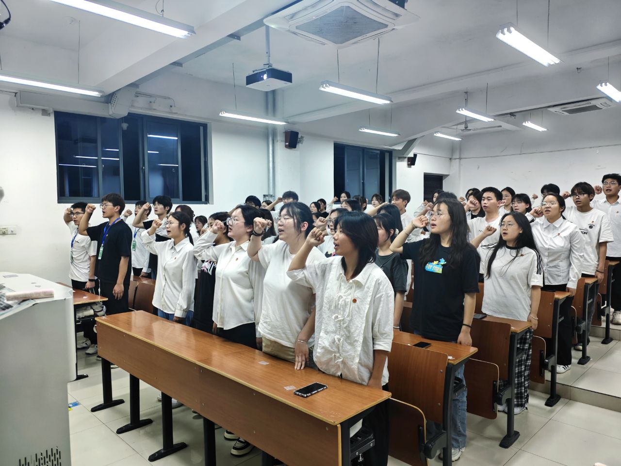 “我们是五月的花海,用青春拥抱时代;我们是初升的太阳,用生命点燃未来……”教室里,共青团员佩戴团员徽章,随着指挥的一挥,团歌的旋律响起,青年们的声音汇聚成一股强大的力量,激荡在每个人的心中。他们用歌声传递着对五四精神的理解和致敬,也表达了新时代青年勇于担当、积极进取的决心。